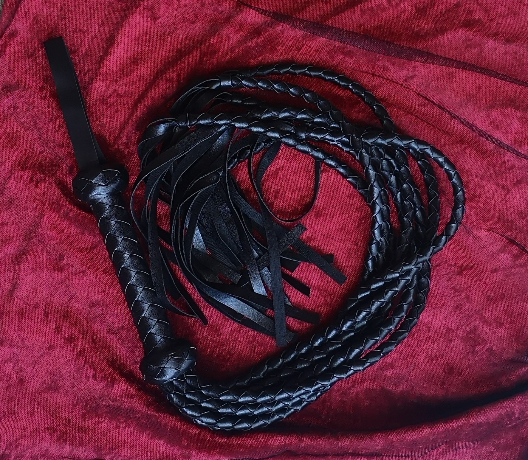 Man lernt vieles durch Ausprobieren. Schon bei leichten Schlägen mit einer solchen Peitsche kann man die Fläche sehen, auf die sie auftrifft. Denkt daran, dass sich die Enden gerne um den Körper herumwickeln, also auf genügend Abstand achten. Übrigens auch zu Möbeln jeglicher Art, zu Vorhängen, zu Blumentöpfen oder Gläsern und Flaschen. Bei dieser Peitsche sind die Riemen über 60 cm lang – dafür braucht man schon Platz, will man die Session nicht mit Aufräumen beenden.